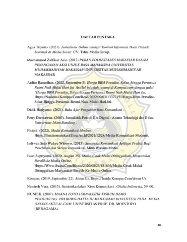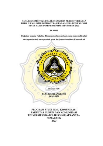 ANGKOSO, PAZA GILAR (2023) ANALISIS SEMIOTIKA CHARLES SANDERS PEIRCE TERHADAP FOTO JURNALISTIK DEMONSTRASI PADA MEDIA KOMPAS.COM STUDI KASUS DEMO BBM PADA SEPTEMBER 2022. Other thesis, Universitas Katolik Soegijapranata Semarang.