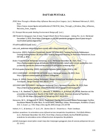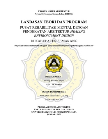 ANJANI, VICTORY KUSUMA (2023) PUSAT REHABILITASI MENTAL DENGAN PENDEKATAN ARSITEKTUR HEALING ENVIRONTMENT DESIGN DI KABUPATEN SEMARANG. Other thesis, Universitas Katholik Soegijapranata Semarang.