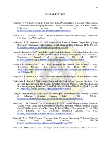 Penelitian itu bertujuan untuk menganalisis pengaruh rasio solvabilitas, rasio likuiditas, rasio profitabilitas, ukuran dewan komisaris, jumlah komite audit, kepemilikan manajerial, dan kepemilikan institusional terhadap financial distress suatu perusahaan. Penelitian im menggunakan 9 perusahaan farmasi yang terdaftar di Bursa Efek Indonesia selama periode 2016-2020 yang dipilih secara purposive sampling berdasarkan kriteria yang ditentukan. Metode statistik yang digunakan dalam penelitian ini adalah model regresi linier berganda Hasil dari penelitian ini menunjukkan bahwa yang berpengaruh rasio solvabilitas, rasio likuiditas dan kepemilikan manajerial berpengaruh terhadap financial distress perusahaan. Variabel rasio profitabilitas, ukuran dewan komisaris, jumlah komite audit, dan kepemilikan institusional tidak berpengaruh terhadap financial distress suatu perusahaan