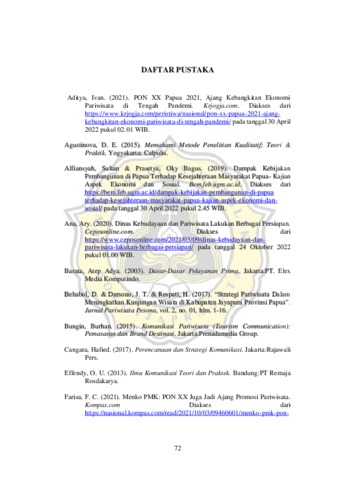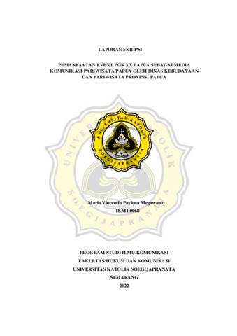 MEGAWANTO, MARIA VINCENTIA PAVIONA (2022) PEMANFAATAN EVENT PON XX PAPUA SEBAGAI MEDIA KOMUNIKASI PARIWISATA PAPUA OLEH DINAS KEBUDAYAAN DAN PARIWISATA PROVINSI PAPUA. S1 thesis, Universitas Katolik Soegijapranata Semarang.