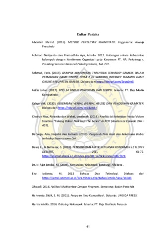 Mobile Legends Bang Bang adalah salah satu contoh game online yang populer saat ini. Yang menarik adalah bahwa permainan yang mempunyai tujuan pembentukan kohesivitas kelompok para pemainnya sering mengucapkan pelbagai kata-kata kasar. Suasana tersebut tampak dalam dinamika Grup FB ML di Semarang.Untuk menemukan korelasi antara kekerasan verbal dengan kohesifitas kelompok, peneliti melakukan penelitian dengan metode kuantitatif. Penelitian ini menggunakan metode dan jenis penelitian kuantitatif korelasi dengan menggunakan teknik pengambilan data kuesioner. Kuesioner disebarkan kepada 100 responden. Teknik pengambilan sampel yang dipakai adalah teknik purposive sampling dengan menggunakan rumus Slovin. Teknik analisis data yang digunakan adalah uji validitas, uji reliabilitas, uji normalitas data, uji linear, uji korelasi Product Moment Pearson, dan uji hipotesis yang digunakan SPSS versi 25. Hasil penelitian menunjukan jika terdapat hubungan antara kekerasan verbal dengan kohesivitas kelompok bermain dalam game Mobile Legends di grup Facebook Mobile Legend Semarang. Hasil tersebut didapatkan melalui uji korelasi yang dilakukan dengan nilai sig 0,005 dimana (<0,05) sehingga data dapat dikatakan memiliki hubungan. Tingkat kekuatan hubungan dalam penelitian ini ada rendah karena nilai korelasi pearson yang didapatkan sebesar (0,282) berada diantara (0,200-0,399) kategori kekuatan rendah.
