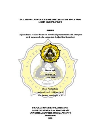 KRISTINA S., KRISTINA S. (2022) ANALISIS WACANA GENDER DALAM RUBRIK SAFE SPACE PADA MEDIA MAGDALENE.CO. S1 thesis, Universitas Katolik Soegijapranata Semarang.