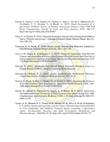 Penyakit diabetes mellitus merupakan penyakit yang timbul akibat tingginya kadar gula darah (hiperglikemia) dan dapat menimbulkan berbagai komplikasi penyakit, seperti gagal ginjal, kebutaan, penurunan fungsi jantung dan otak, serta terganggunya kinerja pembuluh darah. Diabetes mellitus tipe II disebabkan oleh resistensi insulin, yaitu keadaan dimana sel-sel tubuh tidak dapat merespon insulin dan menggunakannya untuk memecah glukosa dalam tubuh sehingga menyebabkan glukosa yang tidak terpecah akan tetap berada di dalam darah. Untuk menangani diabetes, masyarakat Indonesia sudah memanfaatkan tanaman herbal sejak zaman dahulu dengan cara meramu tumbuh-tumbuhan. Dengan kekayaan alamnya, Indonesia memiliki berbagai kekayaan alam yang dapat digunakan untuk pengobatan alami diabetes seperti brotowali, daun sirsak, jahe, dan mahkota dewa. Di zaman modern ini, banyak institusi sudah melakukan penelitian terhadap tanaman-tanaman tersebut, tetapi hasil yang dikemukakan hanya merujuk pada salah satu tanaman saja dan belum ada penelitian yang membandingkan pengaruh bahan-bahan tersebut sebagai minuman fungsional antidiabetes. Maka, tujuan penelitian untuk mengetahui efektivitas dan kadar ekstrak brotowali, daun sirsak, jahe, dan mahkota dewa sebagai minuman fungsional antidiabetes. Metode yang digunakan pada penelitian kali ini adalah literature review dengan cara menganalisis kesenjangan penelitian, membuat desain konseptual penelitian, mengumpulkan literatur, menyaring literatur, dan tabulasi data. Hasil literature review adalah tanaman yang dapat berperan sebagai antidiabetes biasanya memiliki senyawa antioksidan seperti flavonoid, flavonol, dan fenol. Kadar flavonoid tertinggi terdapat pada mahkota dewa, yaitu 161,3 ± 1,58 mg RE/g dan kadar fenol tertinggi terdapat pada daun sirsak sebesar 227.0 ± 20.8 mg GAE/g. Selain itu, nilai IC50 yang adalah nilai konsentrasi yang menunjukkan penghambatan enzim α-glukosidase sebesar 50% dan persentase aktivitas inhibitor α-amilase juga merupakan indikator sebuah tanaman sebagai antidiabetes. Nilai terendah untuk nilai IC50 terdapat pada mahkota dewa, yaitu 1,3 ± 0,2 μg/mL dan dikategorikan sangat aktif. Dalam penerapannya sebagai minuman fungsional, campuran daun sirsak dan jahe lebih disukai panelis daripada mahkota dewa dengan pemanis stevia, yaitu dengan tingkat kesukaan agak suka sampai suka. Jika mengacu pada dosis acarbose pada manusia yaitu 100mg/hari, maka kadar ekstrak bahan yang paling mendekati adalah 25 mg/kg BB ekstrak daun sirsak pada tikus yang dikonversi menjadi 282,24 mg/70kg BB pada manusia.