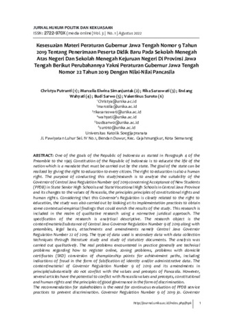 Putranti, Christya and Simandjuntak, Marcella Elwina and SARASWATI, RIKA and YUSTINA, ENDANG WAHYATI and SARWO, YOHANES BUDI and Suroto, Valentinus Kesesuaian Materi Peraturan Gubernur Jawa Tengah Nomor 9 Tahun 2019 Tentang Penerimaan Peserta Didik Baru Pada Sekolah Menegah Atas Negeri Dan Sekolah Menegah Kejuruan Negeri Di Provinsi Jawa Tengah Berikut Perubahannya Yakni Peraturan Gubernur Jawa Tengah Nomor 22 Tahun 2019 Dengan Nilai-Nilai Pancasila. JURNAL HUKUM POLITIK DAN KEKUASAAN, 3 (1). ISSN 2722-970X (media online)