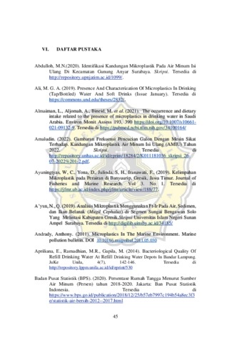Pengelolaan sampah yang belum maksimal dapat berdampak pada lingkungan khususnya perairan. Air menjadi kebutuhan utama dalam kehidupan masyarakat mulai dari aktivitas rumah tangga hingga konsumsi sehari-hari. Sumber air yang diperoleh salah satunya berasal dari air minum dalam kemasan (AMDK) galon isi ulang yang diproduksi oleh depot isi ulang air minum. Kualitas AMDK galon isi ulang perlu diperhatikan karena diketahui mengandung mikroplastik yang dampaknya dapat membahayakan kesehatan. Mikroplastik yang berukuran <5mm dapat berasal dari degradasi dari kemasan galon dan berpotensi terikut saat proses produksi. Oleh karena itu, penelitian ini bertujuan untuk mendeteksi keberadaan mikroplastik AMDK galon isi ulang. Sampel AMDK galon isi ulang yang diambil dari 5 depot air isi ulang di kelurahan Bendan dan Karangrejo sebanyak 20 galon. Sampel air disaring sebanyak 4 liter kemudian dianalisis Particle Suspected Microplastic (PSM) secara visual dengan mikroskop Olympus BX-41 dan jenis polimer diidentifikasi menggunakan Fourier Transform Infra Red (FTIR) IR Tracer-100 dan AIM. Hasil penelitian menunjukkan setiap sampel air mengandung PSM dengan konsentrasi, ukuran, bentuk dan warna yang berbeda. Konsentrasi PSM terbanyak 135,3 partikel/liter dengan kisaran ukuran partikel terbanyak >100-500 μm. Bentuk PSM yang ditemukan yaitu fragmen, film, fiber, filament dan pellet dengan bentuk fragmen yang paling dominan. Warna PSM yang paling banyak ditemukan yaitu biru,bening,abu-abu dan ungu. Partikel teridentifikasi plastik oleh FTIR sebanyak 50% dari total partikel yang ditemukan. Jenis polimer plastik yang banyak ditemukan pada AMDK galon isi ulang yaitu (Poly Vinyl Chloride) PVC, kategori ethylene, acrylic dan lain-lain. Akumulasi keberadaan mikroplastik pada AMDK galon isi ulang dapat berasal dari material kemasan yang digunakan berulang karena tekanan materi plastik. Dampak negatif yang disebabkan oleh mikroplastik seperti peradangan organ, vektor patogen bagi mikroba hingga terhambatnya pertumbuhan.