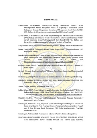 Salah satu kegiatan yang dilakukan oleh hubungan masyarakat (humas) adalah kegiatan pelayanan. Kegiatan pelayan ini diatur dalam Pasal 1 ayat 1 Undangundang Nomor 25 tahun 2009 Tentang Pelayanan Publik. Pelayanan yang dilakukan oleh humas bertujuan agar mendapatkan pemahaman dari masyarakat, serta menghindari kesalahpahaman dalam penyampaian yang dapat berujung pada pandangan negatif masyarakat terhadap organisasi. Pemahaman tersebut biasanya mengenai kegiatan apa saja yang dilakukan oleh pemerintah dan kebijakan apasaja yang dibuat oleh pemerintah, hal tersebut menjadi alasan mengapa keterbukaan informasi publik ini perlu dilaksanakan. Keterbukaan informasi ini diatur dalam Undang-undang Nomor 14 Tahun 2008. Dalam Badan Publik terdapat Pejabat Pengelola Informasi dan Dokumentasi (PPID) sebagai badan yang bertugas melakukan pelayanan, penyediaan serta pendokumentasian informasi untuk mewujudkan keterbukaan informasi publik. Dengan adanya penelitian ini bertujuan untuk mengetahui bagaimana pelaksanaan tugas yang dijalankan oleh PPID pada Dinkominfotik Kabupaten Brebes selaku PPID Utama dalam pelayanan serta penyediaan informasi publik. Metode yang digunakan dalam penelitian ini adalah Kualitatif Deskriptif Analitis dimana data didapatkan dari hasil obeservasi, wawancara dan dokumentasi yang setelah itu dianalisa dan dikelola melalu tahapan reduksi data, penyajian data, serta penarikan kesimpulan. Hasil dari penelitian ini menunjukan tugas apa saja yang dilakukan sebagai PPID Utama. Sebagai PPID Utama Dinkominfotik Kabupaten Brebes melakukan kegiatan penyediaan, penerbitan, pelayanan, pendokumentasian, pembangunan sistem informasi, pengkategorian informasi serta kegiatan kegiatan lain yang berkaitan dengan pelayanan dan penyediaan informasi publik yang pelaksanaanya dapat diakses pada situs ppid.brebeskab.go.id atau media sosial milik Dinkominfotik Kabupaten Brebes. Dapat ditarik kesimpulan bahwa PPID Utama Dinkominfotik Kabupaten Brebes telah melaksanakan tugasnya sebagai PPID Utama sesuai dengan Pasal 12 Peraturan Menteri Dalam Negeri Nomor 3 Tahun 2017.