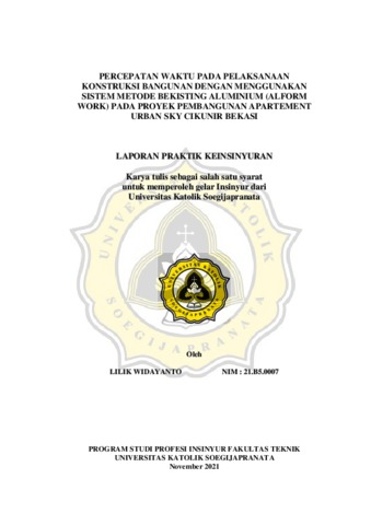 WIDAYANTO, LILIK (2023) PERCEPATAN WAKTU PADA PELAKSANAAN KONSTRUKSI BANGUNAN DENGAN MENGGUNAKAN SISTEM METODE BEKISTING ALUMINIUM (ALFORM WORK) PADA PROYEK PEMBANGUNAN APARTEMENT URBAN SKY CIKUNIR BEKASI. Project Report. Program Studi Teknik Sipil Unika Soegijapranata Semarang. (Unpublished)