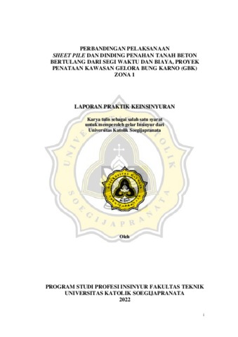 MAS’UDI, MUCHAMMAD NASHICH (2023) PERBANDINGAN PELAKSANAAN SHEET PILE DAN DINDING PENAHAN TANAH BETON BERTULANG DARI SEGI WAKTU DAN BIAYA, PROYEK PENATAAN KAWASAN GELORA BUNG KARNO (GBK) ZONA 1. Project Report. Program Studi Teknik Sipil Unika Soegijapranata Semarang. (Unpublished)