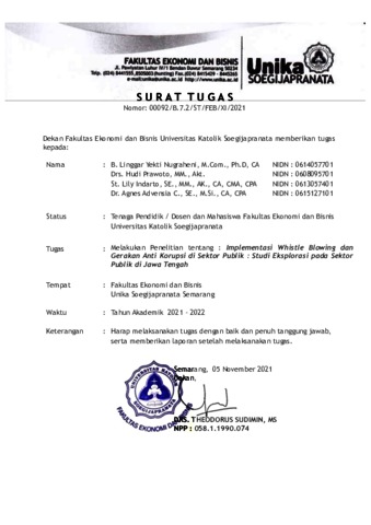 Nugraheni, Bernadia Linggar Yekti and Prawoto, Hudi and Indarto, St. Lily and CHRISMASTUTI, AGNES ADVENSIA LAPORAN PENELITIAN IMPLEMENTASI WHISTLE BLOWING DAN GERAKAN ANTI KORUPSI DI SEKTOR PUBLIK : STUDI EKSPLORASI PADA SEKTOR PUBLIK DI JAWA TENGAH. UNIKA SOEGIJAPRANATA. (Unpublished)