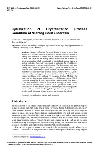 ANANINGSIH, VICTORIA KRISTINA (2022) Optimization of Crystallization Process Condition of Nutmeg Seed Oleoresin. E3S Web of Conference.