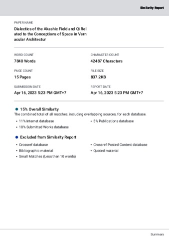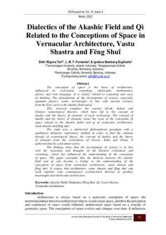 Teh, Sidhi Wiguna and Purwanto, LMF and Sugiharto, Ignatius Bambang Dialectics of the Akashic Field and Qì Related to the Conceptions of Space in Vernacular Architecture, Vastu Shastra and Feng Shui. Dialectics of the Akashic Field and Qì Related to the Conceptions of Space in Vernacular Architecture, Vastu Shastra and Feng Shui, 10 (3). pp. 69-83. ISSN 2738-2222