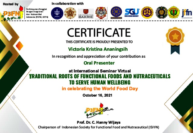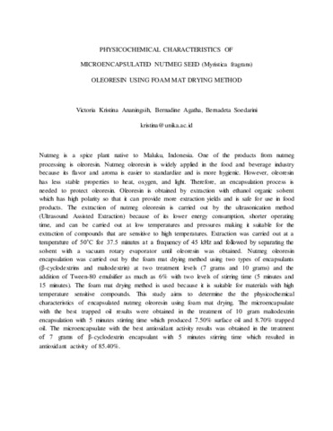 ANANINGSIH, VICTORIA KRISTINA PHYSICOCHEMICAL CHARACTERISTICS OF MICROENCAPSULATED NUTMEG SEED (Myristica fragrans) OLEORESIN USING FOAM MAT DRYING METHOD. P3FNI. (Unpublished)