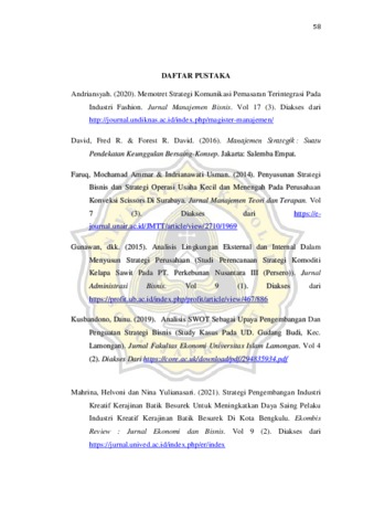 ADRIAN, STEFANUS (2023) ALTERNATIF STRATEGI BERDASARKAN ANALISIS SWOT (STUDI PADA KERAJINAN BATIK TULIS LASEM SEROENI). Other thesis, Universitas Katholik Soegijapranata Semarang.