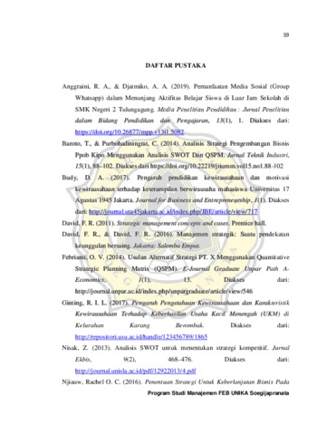 RIMAWAN, REZA ARSYA (2023) PENGEMBANGAN STRATEGI ALTERNATIF UNTUK RITEL FASHION TOKO SAKURA SEMARANG BERDASARKAN QUANTITATIVE STRATEGIC PLANNING MATRIX (QSPM). Other thesis, Universitas Katholik Soegijapranata Semarang.