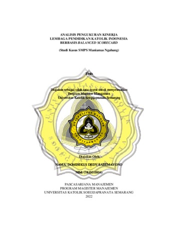 SABEMAYONO, DOMINIKUS DEDY (2023) ANALISIS PENGUKURAN KINERJA LEMBAGA PENDIDIKAN KATOLIK INDONESIA BERBASIS BALANCED SCORECARD (Studi Kasus SMPS Maniamas Ngabang). Masters thesis, Universitas Katholik Soegijapranata Semarang.