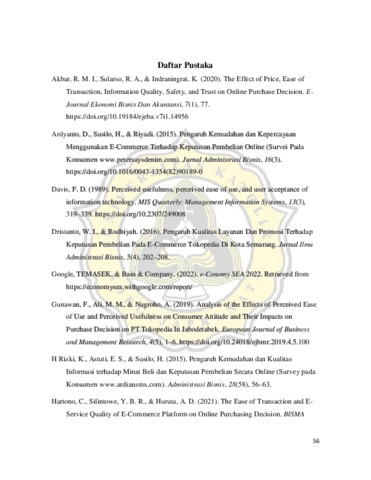 Penelitian ini bertujuan untuk mengetahui pengaruh penggunaan e-commerce terhadap keputusan pembelian pada toko Wingko Babat NN. Meniko. Jenis penelitian yang digunakan dalam penelitian ini adalah dengan menggunakan pendekatan kuantitatif. Terdapat empat variabel independen yang digunakan dalam penelitian ini, yaitu kemudahan, kepercayaan, kualitas informasi, dan kualitas layanan. Sumber data dalam penelitian ini adalah data primer, data primer digunakan dengan menyebarkan kuesioner online kepada responden. Untuk mengukur dan meneliti data dengan tepat maka didalam penelitian ini dilakukan uji validitas dan reliabilitas. Analisis data menggunakan analisis deskriptif dan analisis regresi linier berganda. Hasil penelitian menunjukkan bahwa kemudahan tidak berpengaruh signifikan terhadap keputusan pembelian, kepercayaan tidak berpengaruh signifikan terhadap keputusan pembelian, kualitas informasi tidak berpengaruh signifikan terhadap keputusan pembelian, dan kualitas layanan tidak berpengaruh signifikan terhadap keputusan pembelian. Namun kemudahan penggunaan, kepercayaan, kualitas informasi, dan kualitas layanan secara simultan dapat berpengaruh signifikan terhadap keputusan pembelian.