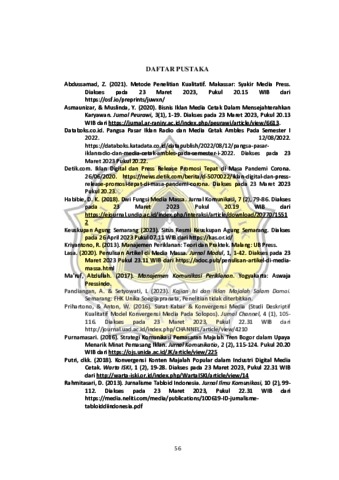 Majalah Salam Damai merupakan majalah bulanan untuk umat Katolik di ruang lingkup Jawa Tengah dan Yogyakarta. Pada penelitian ini, peneliti berfokus pada manajemen periklanan yang dilakukan Majalah Salam Damai pada tahun 2022. Adapun metode penelitian yang digunakan yaitu deskriptif kualitatif, dengan teknik pengambilan data melalui observasi, wawancara dan dokumentasi. Hasil penelitian menunjukkan bahwa Majalah Salam Damai merupakan majalah lokal karena ruang lingkup peredaran yang terbatas yakni di lingkungan Keuskupan Agung Semarang (KAS) dan gereja, Majalah Salam Damai bukan merupakan majalah komersial karena tidak berfokus untuk mencari keuntungan melainkan sebagai media komunikasi antar umat Katolik di lingkup Keuskupan Agung Semarang. Majalah Salam Damai telah melakukan kegiatan perencanaan penawaran iklan, namun hanya dilakukan pada saat periode event-event tertentu saja seperti Paskah, Natal dan HUT Keuskupan Agung Semarang. Majalah Salam Damai telah melakukan kegiatan pelaksanaan manajemen periklanan dengan melakukan penawaran iklan melalui proposal dan surat resmi penawaran iklan yang dikirimkan kepada pengiklan. Majalah Salam Damai melakukan evaluasi ketika jumlah pengiklan tidak mencapai target dengan cara membandingkan jumlah pengiklan dengan majalah rohani lainnya seperti Majalah Inspirasi dan Majalah Utusan. Kesimpulan berdasarkan penelitian ini yaitu Majalah Salam Damai telah melakukan manajemen periklanan yakni perencanaan, pelaksanaan, dan evaluasi, namun hanya dilakukan saat menjelang event dan perayaan Katolik saja seperti Paskah, Natal, atau HUT Keuskupan Agung Semarang. Kata Kunci: Manajemen Periklanan, Media Cetak, Majalah, Majalah Salam Damai