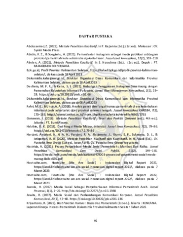 Jumlah pengguna media sosial semakin tahun semakin mengalami perkembangan. Selain itu media sosial juga memiliki manfaat untuk penggunanya. Oleh karena itu humas pemerintah juga memanfaatkan instagram untuk menyebarluaskan informasi kepada masyarakat terutama yang terkait dengan program dan kebijakan. Dalam pelaksanaan tugasnya humas berpedoman pada Permenpan dan RB No.30 tahun 2011 tentang tatakelola kehumasan dilingkungan instansi pemerintah. Peneliti melakukan observasi terhadap 17 Provinsi dan menemukan bahwa Provinsi Kalimantan Selatan melaksanakan tugas humas secara lengkap berdasarkan Peraturan Gubernur nomor 072 tahun 2016. Hal tersebut mendasari peneliti untuk meneliti pelaksanaan tugas humas Diskominfo Provinsi Kalimantan Selatan di instagram @kalselmc sebagai media penyebaran informasi publik. Rumusan masalah penelitian ini adalah bagaimana pelaksanaan tugas humas oleh Diskominfo Provinsi Kalimantan Selatan di akun instagram @kalselmc sebagai media penyebaran informasi publik pada Januari 2021-Maret 2023. Tujuan dari penelitian ini adalah untuk mengetahui pelaksanaan tugas humas oleh Diskominfo Provinsi Kalimantan Selatan di akun instagram @kalselmc. Penelitian ini menggunakan metode penelitian deskriptif kualitatif dengan menggunakan deskripsi data yang diperoleh dari hasil observasi, wawancara, dan dokumentasi. Berdasarkan hasil observasi, wawancara, dan dokumentasi ditemukan bahwa Diskominfo Provinsi Kalimantan selatan sudah melaksanakan tugas humas di akun instagram @kalselmc secara lengkap dan sesuai dengan Permenpan dan RB No.30 tahun 2011, namun dalam pelaksanannya lebih banyak pada tugas nomor 1 dan 3 humas dan lebih mengarah pada edukasi. Selain itu informasi setiap saat di akun unggahannya hanya ada pada informasi mengenai dokumen renstra dan rencana kerja Provinsi Kalimantan Selatan. Kesimpulannya adalah dalam pelaksanaan tugas humas oleh Diskominfo Provinsi Kalimantan Selatan sudah dilaksanakan secara lengkap di instagram @kalselmc terutama pada tugas 1 dan 3. Kemudian informasi setiap saat sudah sesuai dengan undang-undang nomor 14 tahun 2008. Selain itu hasil informasi dan konten di instagram @kalselmc sudah sesuai dengan standar operasional prosedur namun kurang dapat menghasilkan interaksi kepada masyarakat dan like lebih banyak dari pengikut dan jumlah unggahan yang dihasilkan. Kata Kunci : Media Sosial, Humas, Diskominfo, Permenpan dan RB No.30 Tahun 2011
