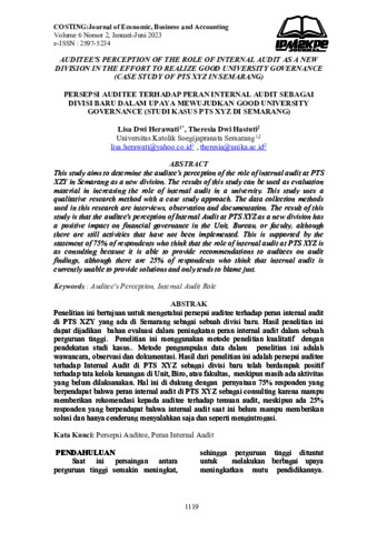 Theresia Dwi Hastuti, Theresia PERSEPSI AUDITEE TERHADAP PERAN INTERNAL AUDIT SEBAGAI DIVISI BARU DALAM UPAYA MEWUJUDKAN GOOD UNIVERSITY GOVERNANCE (STUDI KASUS PTS XYZ DI SEMARANG). PERSEPSI AUDITEE TERHADAP PERAN INTERNAL AUDIT SEBAGAI DIVISI BARU DALAM UPAYA MEWUJUDKAN GOOD UNIVERSITY GOVERNANCE (STUDI KASUS PTS XYZ DI SEMARANG).
