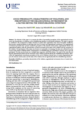 Theresia Dwi Hastuti, Theresia COULD PERSONALITY, CHARACTERISTICS OF VIOLATIONS, AND PERCEPTIONS OF THE ORGANIZATIONAL ENVIRONMENT BE A FACTOR DRIVING THE WHISTLEBLOWING INTENTION? COULD PERSONALITY, CHARACTERISTICS OF VIOLATIONS, AND PERCEPTIONS OF THE ORGANIZATIONAL ENVIRONMENT BE A FACTOR DRIVING THE WHISTLEBLOWING INTENTION?.