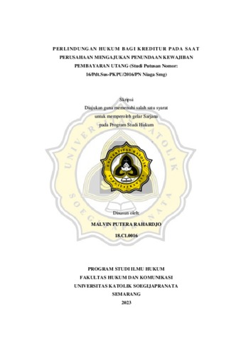 RAHARDJO, MALVIN PUTERA (2023) PERLINDUNGAN HUKUM BAGI KREDITUR PADA SAAT PERUSAHAAN MENGAJUKAN PENUNDAAN KEWAJIBAN PEMBAYARAN UTANG (Studi Putusan Nomor: 16/Pdt.Sus-PKPU/2016/PN Niaga Smg). Other thesis, Universitas Katholik Soegijapranata Semarang.
