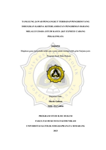 GULTOM, SHERIN (2023) TANGGUNG JAWAB PENGANGKUT TERHADAP PENGIRIM YANG DIRUGIKAN KARENA KETERLAMBATAN PENGIRIMAN BARANG MELALUI UDARA (STUDI KASUS: J&T EXPRESS CABANG PEKALONGAN). Other thesis, Universitas Katholik Soegijapranata Semarang.