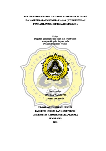 WARDONO, DANICA (2023) PERTIMBANGAN HAKIM DALAM MENJATUHKAN PUTUSAN DALAM PERKARA EKSPLOITASI ANAK ( STUDI PUTUSAN PENGADILAN NO. 55/PID.Sus/2015/PN.SMG ). Other thesis, Universitas Katholik Soegijapranata Semarang.