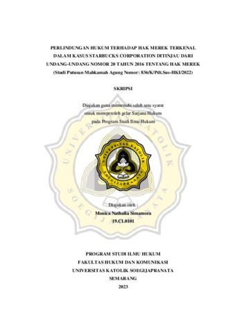 SIMAMORA, MONICA NATHALIA (2023) PERLINDUNGAN HUKUM TERHADAP HAK MEREK TERKENAL DALAM KASUS STARBUCKS CORPORATION DITINJAU DARI UNDANG-UNDANG NOMOR 20 TAHUN 2016 TENTANG HAK MEREK (Studi Putusan Mahkamah Agung Nomor: 836/K/Pdt.Sus-HKI/2022). Other thesis, Universitas Katholik Soegijapranata Semarang.
