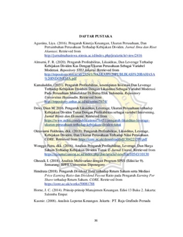 Penelitian ini bertujuan untuk menguji pengaruh return on equity, current ratio, dan debt to equity ratio terhadap dividend payout ratio. Sampel yang diambil dari penelitian ini adalah perusahaan non keuangan yang termasuk di IDX High Dividend 20 periode 2019-2021 yang berjumlah 45 sampel. Sampel dalam penelitian ini diambil dengan metode purposive sampling, dimana pada penelitian ini perusahaan keuangan tidak dimasukan dalam penelitian karena perusahaan keuangan memiliki kebijakan hutang yang berbeda dan pengukuran rasio likuiditas yang berbeda. Penelitian ini menggunakan uji statistik deskriptif, uji asumsi klasik, dan uji T. Pengujian dari penelitian ini, hasil uji T menemukan bahwa Return on Equity (ROE) berpengaruh positif signifikan terhadap Dividend Payout Ratio (DPR) sedangkan Current Ratio (CR) dan Debt to Equity Ratio (DER) tidak berpengaruh signfikan terhadap Dividend Payout Ratio (DPR).