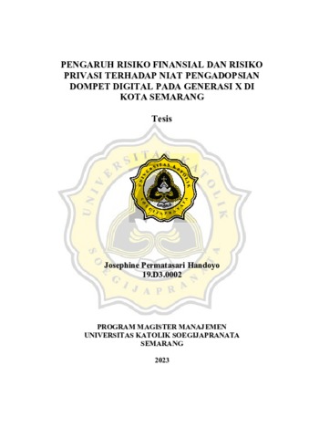 HANDOYO, JOSEPHINE PERMATASARI (2023) PENGARUH RISIKO FINANSIAL DAN RISIKO PRIVASI TERHADAP NIAT PENGADOPSIAN DOMPET DIGITAL PADA GENERASI X DI KOTA SEMARANG. Masters thesis, Universitas Katholik Soegijapranata Semarang.