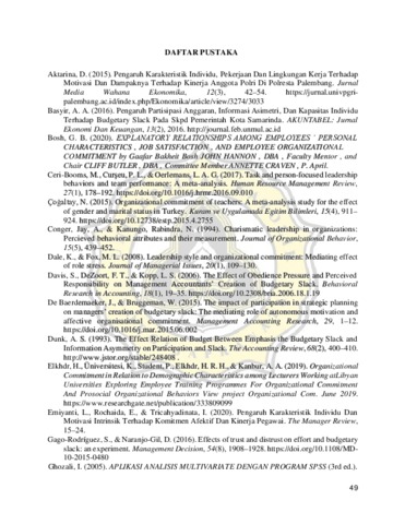 Budgetary slack merupakan tindakan tidak etis yang sering terjadi di perusahaan mendapat sedikit perhatian dimana perusahaan mengalami kerugian dari budgetary slack tersebut. Budgetary slack terjadi dengan cara meninggikan biaya atau menurunkan pendapatan dari yang seharusnya dapat dicapai oleh perusahaan dengan tujuan agar lebih mudah mencapai target yang ditetapkan perusahaan . Tujuan dari penelitian ini yaitu untuk meneliti pengaruh karakteristik individu terhadap komitmen organisasi dan mengetahui interaksi komitmen organisasi dan gaya kepemimpinan terhadap budgetary slack . Sampel dari penelitian ini yaitu manager perusahaan manufaktur di Kota Semarang yang berjumlah 169 manager. Teknik pengumpulan data menggunakan survey dengan cara menyebar kuesioner melalui google form