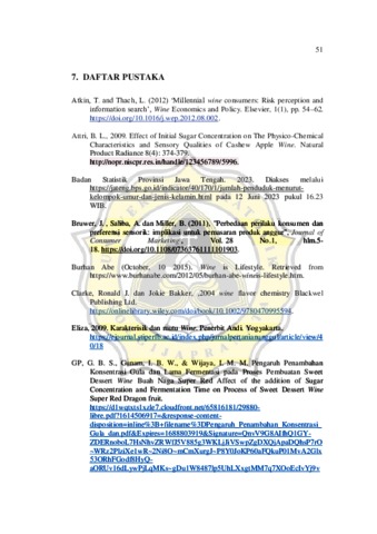 Wine merupakan minuman beralkohol dari hasil fermentasi buah yang biasanya menggunakan buah anggur. Wine pairing adalah suatu pengetahuan mengenai wine yang cocok untuk dipasangkan dengan suatu hidangan tertentu. Tujuan dari penelitian ini adalah untuk mengetahui pengetahuan masyarakat mengenai wine berdasarkan karakteristik sosialnya, mengetahui pengetahuan masyarakat tentang wine pairing serta menentukan hubungan antara pengetahuan wine dan wine pairing dengan perilaku konsumsi wine pairing. Penelitian ini merupakan penelitian survey yang dilakukan secara online untuk menganalisis persepsi masyarakat terhadap tren wine pairing di Indonesia. Survey dilakukan dengan membagikan kuisioner dalam bentuk google form dan disebarkan melalui media sosial. Adapun pertanyaan kuisioner dibagi menjadi 3 parameter antara lain karakteristik responden, pengetahuan wine dan makanan, serta perilaku atau kebiasaan konsumsi wine. Variabel yang digunakan pada penelitian ini yaitu pengetahuan tentang konsumsi wine pairing, konsumsi wine pairing dan perilaku konsumsi wine pairing pada masyarakat dengan memfokuskan kajian pada pembagian karakteristik menjadi 2 kelompok berdasarkan kadar alkohol dalam wine. Data survey yang terkumpul kemudian dilakukan tabulasi data, coding sesuai dengan tingkat ordinasi, reduksi data, analisis kelayakan yang meliputi uji validitas dan uji reliabilitas, kemudian uji beda antara kelompok masyarakat yang mengetahui dan tidak mengetahui wine berdasarkan deskripsi responden, pengetahuan wine dan makanan, serta perilaku atau kebiasaan konsumsi wine. Hasil uji beda tidak ditemukan adanya perbedaan yang nyata pada indikator karakteristik responden (gender, usia, agama, domisili, pekerjaan dan pendapatan), jenis minuman yang termasuk wine, apakah wine menyehatkan, manfaat wine, kisaran harga wine lokal, istilah wine pairing, makanan yang biasa dipasangkan dengan wine, makanan yang cocok dengan tiap karakter wine, peluang wine pairing, kelompok sosial yang menerima wine pairing, menganggarkan biaya konsumsi wine, seberapa sering konsumsi wine, jenis wine yang paling disukai, harga wine yang biasa dikonsumsi, terakhir kali konsumsi wine dan alasan konsumsi wine. Tidak adanya perbedaan yang nyata menunjukkan bahwa tahu atau tidak tahu kadar alkohol dalam wine tidak mempengaruhi indikator-indikator yang disebutkan diatas. Hasil survey menyatakan bahwa secara umum mayoritas responden yang mengisi survey adalah laki-laki berusia 17-25 tahun, beragama Kristen dan Katolik, berdomisili di Ibu Kota Kecamatan, berprofesi sebagai pegawai swasta dan memiliki penghasilan > Rp 7.000.000. Pengertian wine menunjukkan perbedaan yang nyata dimana jumlah responden yang mengetahui kadar alkohol dan menjawab dengan benar pengertian wine berbeda nyata dengan jumlah responden yang tidak mengetahui kadar alkohol dan menjawab benar pengertian wine. Kategori dampak konsumsi wine membuat kesulitan tidur responden yang mengetahui kadar alkohol dalam wine berbeda nyata dengan dampak konsumsi wine membuat kesulitan tidur responden yang tidak mengetahui kadar alkohol dalam wine. Batasan konsumsi wine 1 sloki per minggu kelompok responden yang mengetahui kadar alkohol dalam wine berbeda nyataa dengan batasan konsumsi wine 1 sloki vii per minggu kelompok responden yang tidak mengetahui kadar alkohol dalam wine. Hasil survey perilaku atau kebiasaan konsumsi wine menunjukkan responden tidak tentu untuk menganggarkan biaya untuk konsumsi wine, frekuensi mengkonsumsi wine setahun 1 sampai 2 kali, lebih suka mengkonsumsi wine bersama teman, jenis wine yang paling disukai adalah redwine dengan kisaran harga RP 250.000-Rp350.000, alasan mengkonsumsi pribadi pada waktu santai dan terakhir kali mengkonsumsi sekitar 4 sampai 6 bulan lalu. Pengaruh karakteristik responden dan pengetahuan konsumsi wine pairing terhadap perilaku konsumsi wine tidak dapat disamakan antara sesama responden, karena setiap individu memiliki preferensi dan kecenderungan yang berbeda terkait konsumsi wine. Maka, penting untuk memahami bahwa pengaruh karakteristik dan pengetahuan dapat beragam antara setiap individunya.