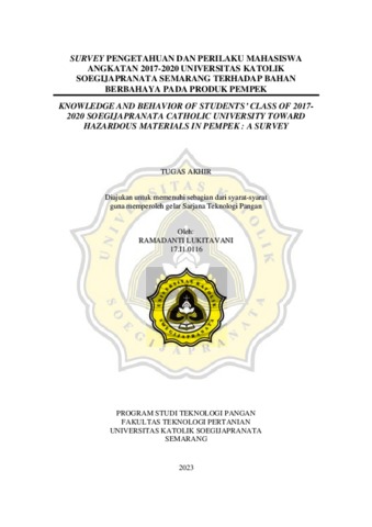 LUKITAVANI, RAMADANTI (2023) SURVEY PENGETAHUAN DAN PERILAKU MAHASISWA ANGKATAN 2017-2020 UNIVERSITAS KATOLIK SOEGIJAPRANATA SEMARANG TERHADAP BAHAN BERBAHAYA PADA PRODUK PEMPEK. Other thesis, Universitas Katholik Soegijapranata Semarang.
