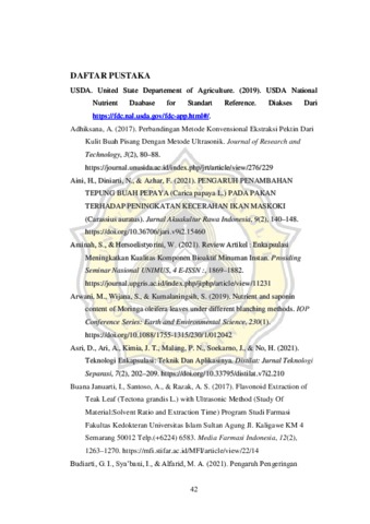 Daun kelor merupakan bagian pada tanaman kelor yang memiliki banyak kandungan nutrisi dan antioksidan yang baik bagi tubuh. Kandungan nutrisi yang ada pada daun kelor yaitu karbohidrat, lemak, protein, mineral, vitamin dan asam amino. Sementara antioksdian yang terdapat pada daun kelor yaitu flavonoid, tannin, terpenoid, alkaloid serta saponin. Tetapi, daun kelor memiliki aroma langu dan rasa pahit yang diakibatkan oleh kandungan senyawa saponin. Kandungan saponin yang terdapat pada daun kelor sebesar 81 g/kg. Aroma langu dan rasa pahit pada daun kelor dapat dikurangi dengan melakukan metode ekstraksi ultrasonik dan enkapsulasi. Ekstraksi ultrasonik yang dilakukan pada daun kelor bertujuan dalam menarik senyawa bioaktif dengan menggunakan pelarut aquades, sehingga senyawa saponin dapat dikurangi. Sementara, proses enkapsulasi yang dilakukan pada daun kelor bertujuan untuk melindungi komponen senyawa bioaktif lainnya. Berdasarkan hal itu, maka penelitian ini bertujuan untuk menetapkan kombinasi perlakuan rasio perbandingan bubuk daun kelor dengan aquades dan lama waktu ekstraksi ultrasonik terbaik dalam mengurangi langu dan rasa pahit pada daun kelor, mengetahui kombinasi terbaik rasio ekstrak daun kelor dengan bahan penyalut enkapsulasi serta mengetahui perbedaan karakteristik kimia dan fisik enkapsulasi ekstrak daun kelor berdasarkan perbedaan rasio perbandingan bahan penyalut. Penelitian ini dilakukan secara eksperimental yang terdiri atas 2 penelitian yaitu penelitian pendahuluan dan penelitian utama. Penelitian pendahuluan terdiri atas beberapa proses berupa pembuatan bubuk daun kelor, ekstraksi ultarsonik dan analisa yang terdiri dari analisa saponin, analisa flavonoid dan analisa antioksidan. Penelitian pendahuluan bertujuan untuk menentukan kombinasi terbaik antara perbandingan rasio bubuk daun kelor dengan aquades, lama waktu ekstraksi ultrasonik dan suhu rotary vacuum evaporator. Hasil kombinasi terbaik merupakan hasil dari kadar saponin terendah, flavonoid tertinggi, serta antioksidan tertinggi. Hasil analisa tersebut akan dilanjutkan pada penelitian utama yang terdiri dari proses pembuatan bubuk daun kelor, ekstraksi ultrasonik, enkapsulasi ekstrak daun kelor, analisa fisik, analisa kimia dan uji organoleptik. Pada penelitian utama, terdapat 3 variabel pada proses xiv enkapsulasi ekstrak daun kelor yaitu perbandingan rasio bahan inti dan penyalut (1:2, 1:10 dan 1:20), lama waktu pengeringan menggunakan vacuum drying (24 jam dan 48 jam) serta rasio perbandingan maltodekstrin dan Whey Protein Isolate (WPI) (2:1;24 jam, 2:1;48 jam, 1:2;24 jam dan 1:2;48 jam) yang disusun dengan desain faktorial 3x2x2 dan dilakukan ulangan sebanyak 4 kali. Kombinasi penelitain tersebut akan diamati parameter kimia berupa kadar antioksidan, kadar falvonoid, pH dan kadar air. Selain itu, penelitian ini juga akan diamati parameter fisik berupa warna.. Berdasarkan hasil yang diperoleh pada penelitian ini, diketahui bahwa proses enkapsulasi berpengaruh terhadap parameter fisik, kimia dan sensori es krim. Proses enkapsulasi dalam penelitian ini dapat menutupi rasa pahit dan aroma langu daun kelor, tetapi proses enkapsulasi ini belum dapat mempertahankan antioksidan pada daun kelor. Rasio perbandingan maltodekstrin dan Whey Protein Isolate (WPI) 1:2;24 jam dan 1:2;48 jam menghasilkan total flavonoid dan aktivitas antioksidan yang lebih tinggi.
