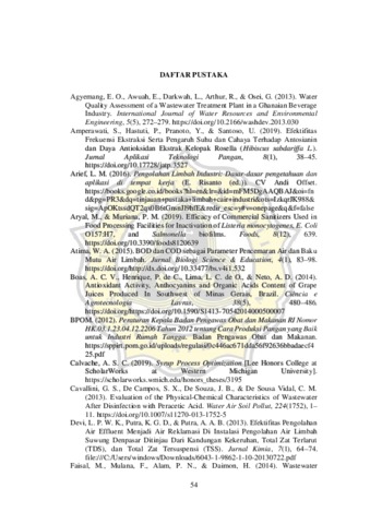 Limbah tidak dapat digunakan kembali. Limbah berdasarkan sifatnya dapat dibagi menjadi limbah padat, cair, dan gas. Limbah yang akan diuji dalam penelitian ini merupakan limbah cair dari produksi sirup. Limbah cair memiliki karakteristik yang meliputi karakteristik fisik, kimia, dan biologi. Karakteristik fisik limbah terdiri dari total dissolved solid (TDS), total suspended solid (TSS), dan total solid (TS), dan tingkat kekeruhan. Karakteristik kimia limbah terdiri dari biochemical oxygen demand (BOD), chemical oxygen demand (COD), dan pH. Karakterisik biologi limbah terdiri dari mikroorganisme yang terkandung dalam limbah. Penelitian ini bertujuan untuk mengetahui hasil analisis karakteristik fisik dan kimia limbah cair setelah mesin produksi dilakukan sanitasi pada masing-masing konsentrasi serta mengetahui apakah nilai dari uji karakteristik fisik dan kimia limbah cair telah sesuai dengan baku mutu industri sirup menurut Peraturan Daerah Provinsi Jawa Tengah No 5 Tahun 2012. Dalam penelitian ini, akan dilakukan uji karakteristik fisik dan kimia dari air limbah sirup yang diperoleh dari proses cleaning menggunakan air hangat dengan suhu 46℃, sanitasi mesin menggunakan Peracetic Acid (PAA) dengan tiga tingkatan konsentrasi yakni 200 ppm, 250 ppm, dan 300 ppm, serta proses pembilasan menggunakan air panas dengan suhu ±70℃. Setelah dilakukan pengambilan sampel, sampel dilakukan uji kekeruhan menggunakan turbidimeter, TDS, TSS, dan TS secara gravimetri, BOD menggunakan DO-meter, COD menggunakan titrasi, dan pH menggunakan pH-meter. Dari pengujian tersebut, untuk dapat dibuang langsung ke lingkungan perlu dilakukan analisa berdasarkan Peraturan Daerah Provinsi Jawa Tengah Nomor 5 Tahun 2012 tentang baku mutu air limbah sirup. Hasil uji karakteristik yang memenuhi baku mutu air limbah industri sirup tersebut yang dapat langsung dibuang ke lingkungan. Apabila belum memenuhi baku mutu, air limbah sirup perlu melalui proses pengolahan terlebih dahulu. Berdasarkan penelitian ini, dapat diketahui bahwa semakin tinggi konsentrasi PAA yang digunakan maka semakin rendah hasil uji karakteristik. Hasil uji kekeruhan, TDS, TSS, TS, COD, dan pH berbanding lurus satu sama lain. Namun, hasil uji BOD berbanding terbalik dengan uji karakteristik lainnya. Berdasarkan hasil pengujian tingkat kekeruhan, TS, dan TDS air limbah sirup untuk masing-masing tingkat konsentrasi PAA mengalami penurunan, namun batas maksimalnya belum ditetapkan oleh baku mutu air limbah industri sirup. Selanjutnya, hasil pengujian TSS untuk air limbah sirup pada semua konsentrasi PAA diperoleh hasil yang kecil dan memenuhi baku mutu air limbah sirup. Uji pH air limbah sirup pada beberapa kadar konsentrasi PAA diperoleh hasil di bawah 6 dan menurun, namun tidak memenuhi baku mutu air limbah sirup. Selain itu, uji COD air limbah sirup pada setiap tingkat konsentrasi PAA mengalami penurunan; hanya konsentrasi PAA 300 ppm yang memenuhi baku mutu air limbah sirup, sedangkan konsentrasi PAA 200 ppm dan 250 ppm tidak memenuhi baku mutu. Terakhir, uji BOD air limbah sirup dari air limbah sirup menghasilkan nilai BOD yang relatif kecil dengan konsentrasi PAA yang terus meningkat namun masih memenuhi baku mutu air limbah sirup.