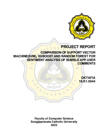 OKTAFIA, OKTAFIA (2023) COMPARISON OF SUPPORT VECTOR MACHINE(SVM), XGBOOST AND RANDOM FOREST FOR SENTIMENT ANALYSIS OF BUMBLE APP USER COMMENTS. Other thesis, UNIVERSITAS KHATOLIK SOEGIJAPRANATA.