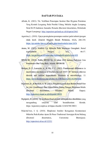 Permasalahan kesehatan yang berhubungan dengan pangan merupakan masalah yang kompleks dan sangat sering terjadi pada kehidupan. Berdasarkan World Health Organization (WHO) pada tahun 2015 diketahui bahwa 100.000 anak Indonesia meninggal dunia karena penyakit yang berkaitan dengan pengolahan pangan. Oleh karena itu, diperlukan pencegahan permasalahan kesehatan yang berhubungan dengan pangan dengan pengontrolan proses produksi produk pangan. Good Hygiene Practices (GHP) adalah pedoman higenitas produksi pangan untuk menghasilkan produk pangan yang bermutu dan aman untuk dikonsumsi. Salah satu aspek dalam GHP adalah sanitasi. Sanitasi merupakan upaya untuk memelihara dan melindungi lingkungan dari berbagai potensi cemaran. Sanitasi terbagi menjadi 4 bagian yaitu higenitas pekerja, sanitasi gedung, sanitasi alat, dan sanitasi mesin. Sanitasi merupakan salah satu aspek yang diperlukan oleh Tim Mini Plant Sirup UNIKA Soegijapranata dalam memelihara fasilitas dan menjaga kualitas produk yang dihasilkan. Tujuan dari penelitian ini adalah untuk mengetahui perbandingan efektivitas penggunaan desinfektan berbahan aktif paracetic acid (PAA) dengan variasi konsentrasi terhadap jumlah mikroba dalam udara dan meja mini plant sirup UNIKA kampus BSB, mengetahui konsentrasi optimal desinfektan dalam rentang 1200-1400ppm untuk dipergunakan dalam udara dan meja mini plant sirup UNIKA kampus BSB, dan mengetahui jumlah mikroba pada pekerja saat proses produksi. Terdapat 3 metode yang dipergunakan dalam penelitian ini yaitu metode cawan papar untuk total plate count udara, metode cawan kontak untuk total plate count meja, dan swab untuk pekerja. Terdapat 3 konsentrasi PAA yang dipergunakan pada desinfektan yaitu 1200 ppm, 1300 ppm, 1400 ppm. Hasil yang terbaik diperoleh pada desinfektan PAA dengan konsentrasi 1400 ppm karena dapat memenuhi standar dari BPOM 2018. Selain itu, jumlah mikroba pada tangan dan jas laboratorium pekerja berbanding lurus dengan lama waktu produksi.