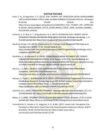 Kasus pelecehan seksual di Indonesia sendiri yang dirilis oleh Kementrian Pemberdayaan Perempuan dan Perlindungan Anak Republik Indonesia mencapai 15.000 kasus per Januari 2022. Dampak yang terjadi pada korban salah satunya adalah dampak emosional pada korbannya yang mana salah satunya korban akan mengalami gangguan PTSD atau post-traumatic stress disorder, yang mana korban akan mengalami ketakutan yang intens, kecemasan tinggi, dan emosi yang kaku setelah peristiwa traumatis itu terjadi. anak yang mengalami PTSD akibat dari pelecehan seksual dapat ditangani dengan menggunakan play therapy, play therapy ini sendiri terdapat beberapa Teknik untuk membuat anak dapat mengekspresikan perasaannya salah satunya ialah art expression. Art expression sendiri merupakan sebuah sarana atau media dimana anak-anak dapat mengekspresikan apa yang mereka rasakan melalui gambar atau coretan-coretan dengan alat seperti crayon, cat, pensil warna, dan kertas gambar. Maka dari itu peneliti ingin merancang buku interaktif art expression yang akan digunakan sebagai sarana anak untuk mengungkapkan apa yang mereka rasakan setelah mengalami kejadian tersebut, yang dimana mereka bisa menceritakan dan mencurahkan perasaan mereka setelah mengalami hal tersebut tanpa merasa dihakimi dan disalahkan atas peristiwa yang mereka alami