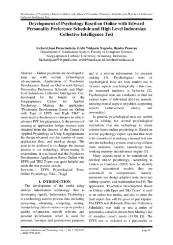 SUDARTO, RICHARD JUAN PUTRA and Nugroho, Erdhi Widyarto and Prasetya, FX Hendra (2021) Development of Psychology Based on Online with Edward Personality Preference Schedule and High Level Indonesian Collective Intelligence Test. journal of busines and technology, 1 (2). pp. 49-53. ISSN e-ISSN: 2776-0332