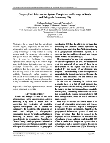 Pamungkas, Stefanus Lintang Timur Aji and Widiantoro, Albertus Dwiyoga and Prasetya, FX Hendra (2021) Geographical Information System Complaints on Damage to Roads and Bridges in Semarang City. journal of busines and technology, 1 (3). pp. 104-109. ISSN e-ISSN: 2776-0332