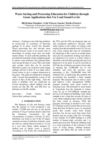 Panjaitan, Bill Berthan and Nugroho, Erdhi Widyarto and Prasetya, FX Hendra (2022) Waste Sorting and Processing Education for Children through Game Applications that Use Loud Sound Levels. journal of busines and technology, 2 (3). pp. 101-107. ISSN e-ISSN: 2776-0332