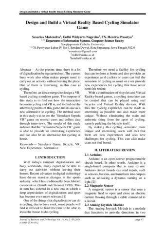 MAHENDRA, SESARIUS SATRIA LINTANG and Nugroho, Erdhi Widyarto and Prasetya, FX Hendra (2023) Design and Build a Virtual Reality Based Cycling Simulator Game. journal of busines and technology, 3 (2). pp. 67-73. ISSN e-ISSN: 2776-0332