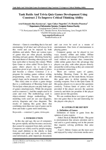 KURNIAWAN, ARIEL EDMUNDO HAN and Nugroho, Agus Cahyo and Prasetya, FX Hendra (2023) Tank Battle And Trivia Quiz Games Development Using Construct 2 To Improve Critical Thinking Ability. journal of busines and technology, 3 (2). pp. 74-81. ISSN e-ISSN: 2776-0332