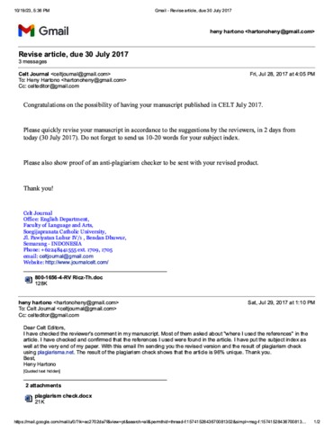 HARTONO, HENY Korespondensi artikel " Towards Teachers’ Communicative Competence Enhancement: A Study on School Preparation for Bilingual Programs". Universitas Katolik Soegijapranata. (Unpublished)