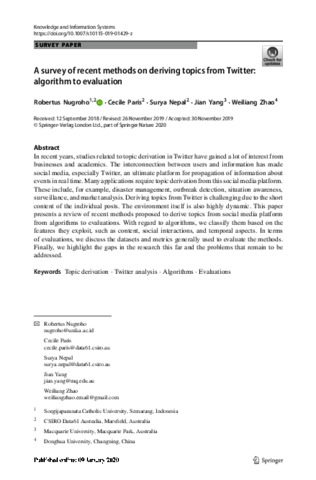 R. Setiawan, Aji Nugroho and Paris, Cecile and Nepal, Surya and Yang, Jian and Zhao, Weiliang A Survey of Recent Methods on Deriving Topics from Twitter : Algorithm to Evaluation. Knowledge and Information Systems.