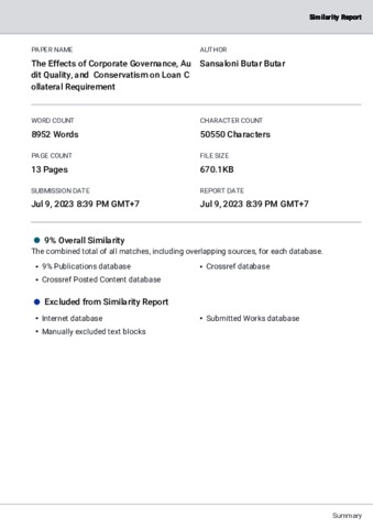 Butar Butar, Sansaloni Turnitin: The Effects of Corporate Governance, Audit Quality, and Conservatism on Loan Collateral Requirements. Turnitin Corp.