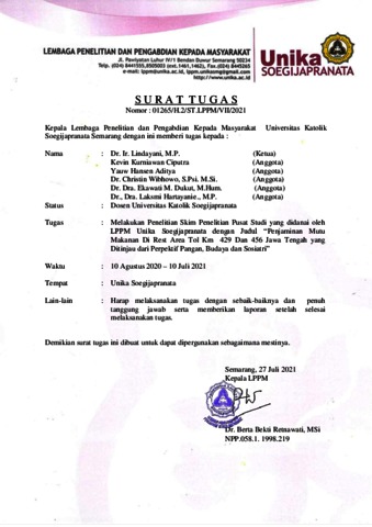 LINDAYANI, LINDAYANI and Wibhowo, Christine and Dukut, Ekawati Marhaenny and HARTAYANIE, LAKSMI Laporan Penelitian Penjaminan Mutu Makanan di Rest Area Tol KM 429 dan 456 Jawa Tengah yang Ditinjau Dari Perspektif Pangan, Budaya dan Sosiatri. Unika Soegijapranata.
