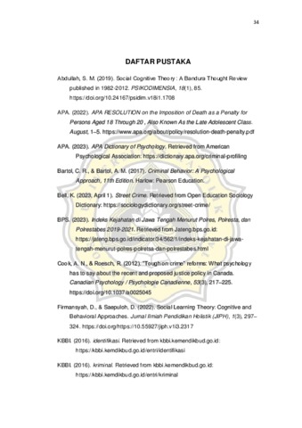 Kejahatan akan selalu ada di dalam kehidupan manusia. Kejahatan dapat terjadi di manapun, kapanpun, dan dilakukan oleh siapapun. Jenis kejahatan yang sering terjadi di Indonesia adalah kejahatan konvensional. Kejahatan jalanan termasuk dalam kejahatan konvensional. Pencurian, kekerasan, pembunuhan, dan pengrusakkan merupakan beberapa bentuk dari kejahatan jalanan. Penulisan ini akan membahas profil demografi dan profil perilaku para pelaku tindak kejahatan jalanan secara mendalam. Social Learning Theory akan dijadikan acuan dalam pembahasan. Perilaku kejahatan jalanan merupakan hasil belajar dengan cara mengamati perilaku kejahatan yang dilakukan oleh role model para pelaku. Penulisan laporan ini menggunakan pendekatan deskriptif kualitatif. Metode yang digunakan untuk memperoleh data adalah wawancara. Metode diterjemahkan dalam bentuk kegiatan magang di Polrestabes Semarang khususnya di Unit Reserse Mobile (Resmob). Unit Resmob Semarang secara khusus menangani kasus kejahatan jalanan yang terjadi di Kota Semarang. Partisipan wawancara adalah tiga pelaku kekerasan dan tiga pelaku pencurian. Seluruh pelaku berjenis kelamin laki-laki, berusia 17-35 tahun, memiliki latar pendidikan SMA/SMK ke bawah, dan berasal dari golongan masyarakat ekonomi kelas menengah ke bawah. Sebagian besar pelaku memiliki role model yang berasal dari lingkungan pertemanan. Seluruh pelaku telah melalui tahapan proses belajar Social Learning Theory, yaitu atensi, retensi, reproduksi motorik, dan penguatan. Keenam pelaku tidak pernah mengalami punishment yang efektif untuk menghentikan tindakan kejahatan yang mereka lakukan sebelum ditangkap oleh pihak kepolisian. Keenam pelaku mengaku jera setelah tertangkap oleh pihak kepolisian.