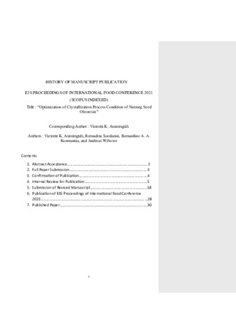 ANANINGSIH, VICTORIA KRISTINA History of manuscript publication E3S Proceedings. Optimization of Crystallization Process Condition of Nutmeg Seed Oleoresin. (Unpublished)