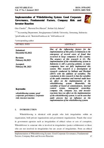 Claudia, Gita and HASTUTI, THERESIA DWI and Indarto, St. Lily (2023) Implementation of Whistleblowing System: Good Corporate Governance, Fundamental Factors, Company Risk and Investor Reaction. Akuntabilitas, 17 (1). pp. 67-94. ISSN 2685-7030